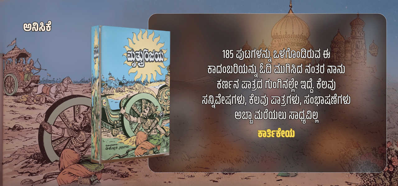 185 ಪುಟಗಳನ್ನು ಒಳಗೊಂಡಿರುವ ಈ ಕಾದಂಬರಿಯನ್ನು ಓದಿ ಮುಗಿಸಿದ ನಂತರ ನಾನು ಕರ್ಣನ ಪಾತ್ರದ ಗುಂಗಿನಲ್ಲೇ ಇದ್ದೆ. ಕೆಲವು ಸನ್ನಿವೇಷಗಳು, ಕೆಲವು ಪಾತ್ರಗಳು, ಸಂಭಾಷಣೆಗಳು ಅಬ್ಬಾ ಮರೆಯಲು ಸಾಧ್ಯವಿಲ್ಲ'. ಎನ್ನುತ್ತಾರೆ ಬರೆಹಗಾರ ಕಾರ್ತಿಕೇಯ. ಅವರು ಮರಾಠಿ ಕಾದಂಬರಿಕಾರ ಶಿವಾಜಿ ಸಾವಂತ ಅವರು ಬರೆದ, ಲೇಖಕ ಅಶೋಕ ನೀಲಗಾರ ಅನುವಾದಿಸಿದ 'ಮೃತ್ಯುಂಜಯ' ಕೃತಿಗೆ ಬರೆದ ಅನಿಸಿಕೆ...